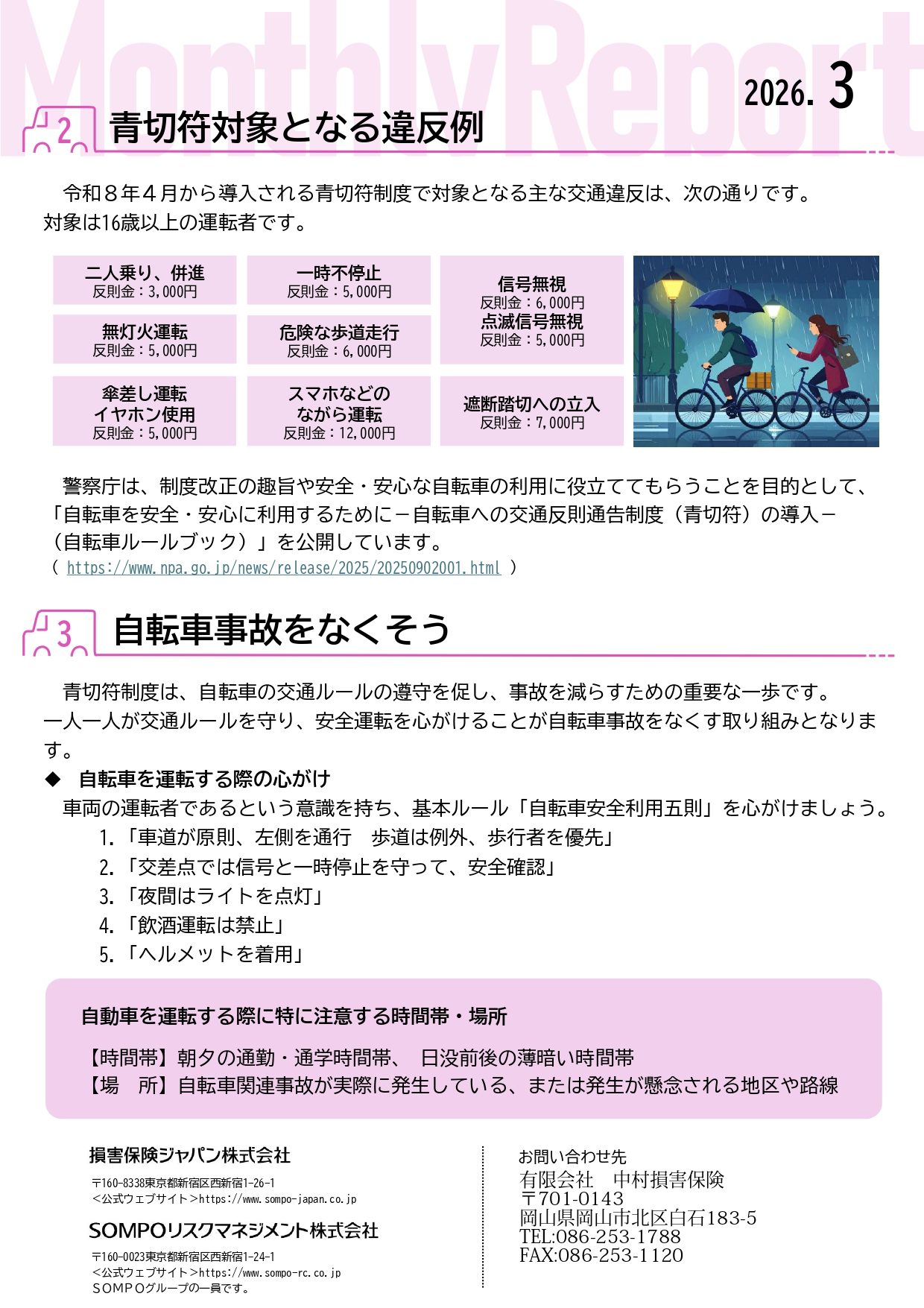 自転車は身近な移動ツールです。しかし死亡・重症事故件数は令和6年で 7,000件を超えており、ルール違反も社会的な問題となっております。 令和8年4月から自転車運転者を対象に青切符が導入されますのでチラシをご覧になり導入の背景、違反例をご確認ください。